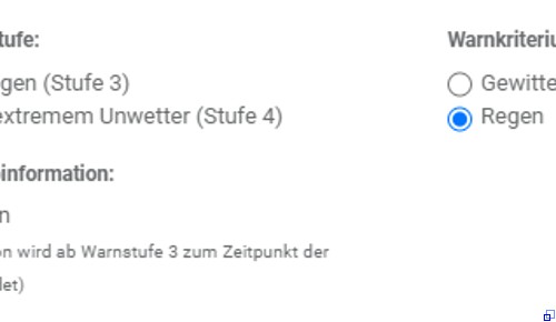 Mit der aktuellen Version 3.2.14 wurde diese Funktion erweitert, so dass Sie diese Indikatoren nun gemeindescharf einrichten können. Wie bei den Landkreiswarnungen können Sie auch hier entscheiden, über welche Warnstufen (Vorabinformation Unwetter, Unwetterwarnung, Warnung vor extremem Unwetter) und welches Warnkriterium (Gewitter oder Regen) Sie informiert werden möchten.